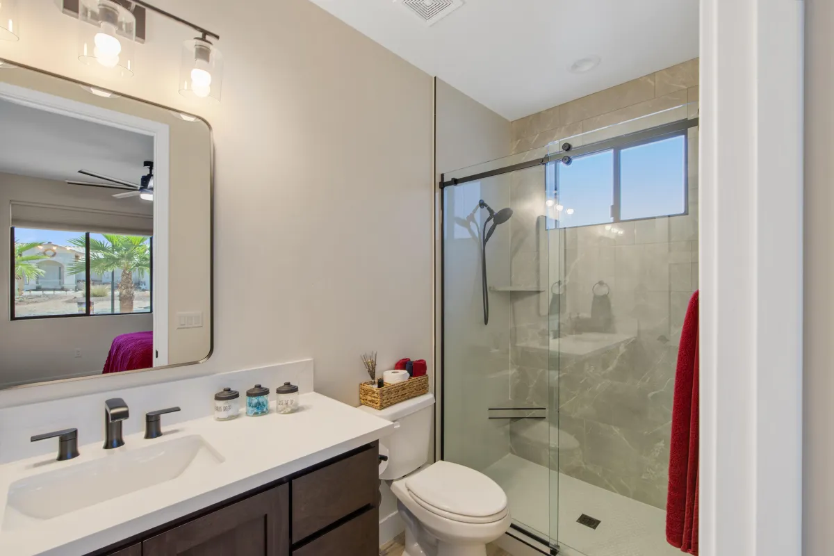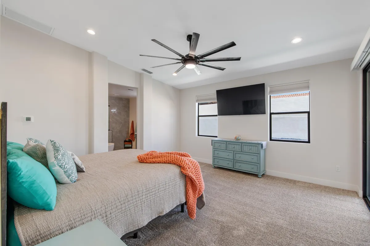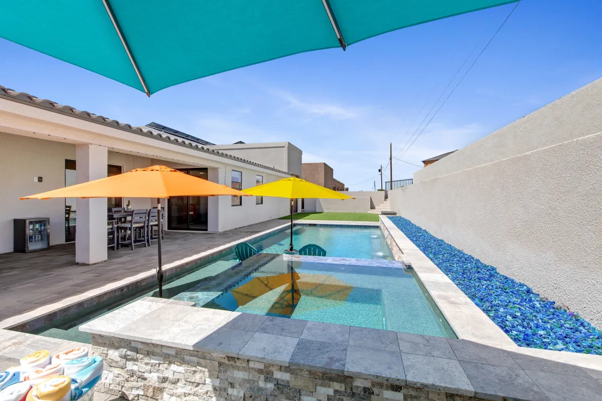 The master retreat features a walk in closet, soaking tub and dual shower heads. There is a Mini master with attached bathroom. 2 more generous sized guest bedrooms and a guest bathroom. The backyard was built for entertaining with a newly built (2023) heated pool and spa and a misting system. Pool is wired for a chiller as well. OWNED solar for low utility bills.