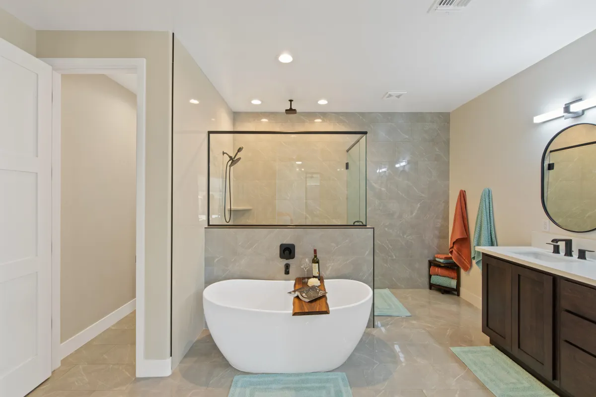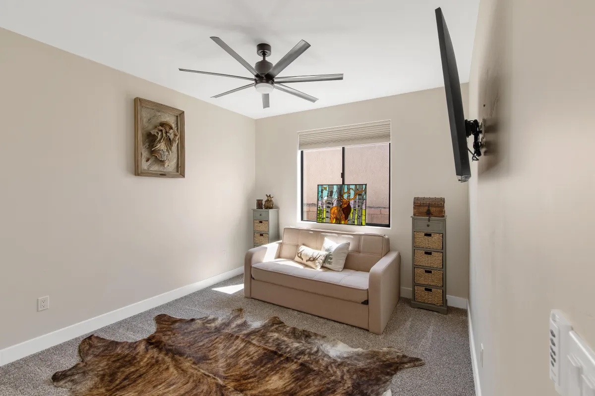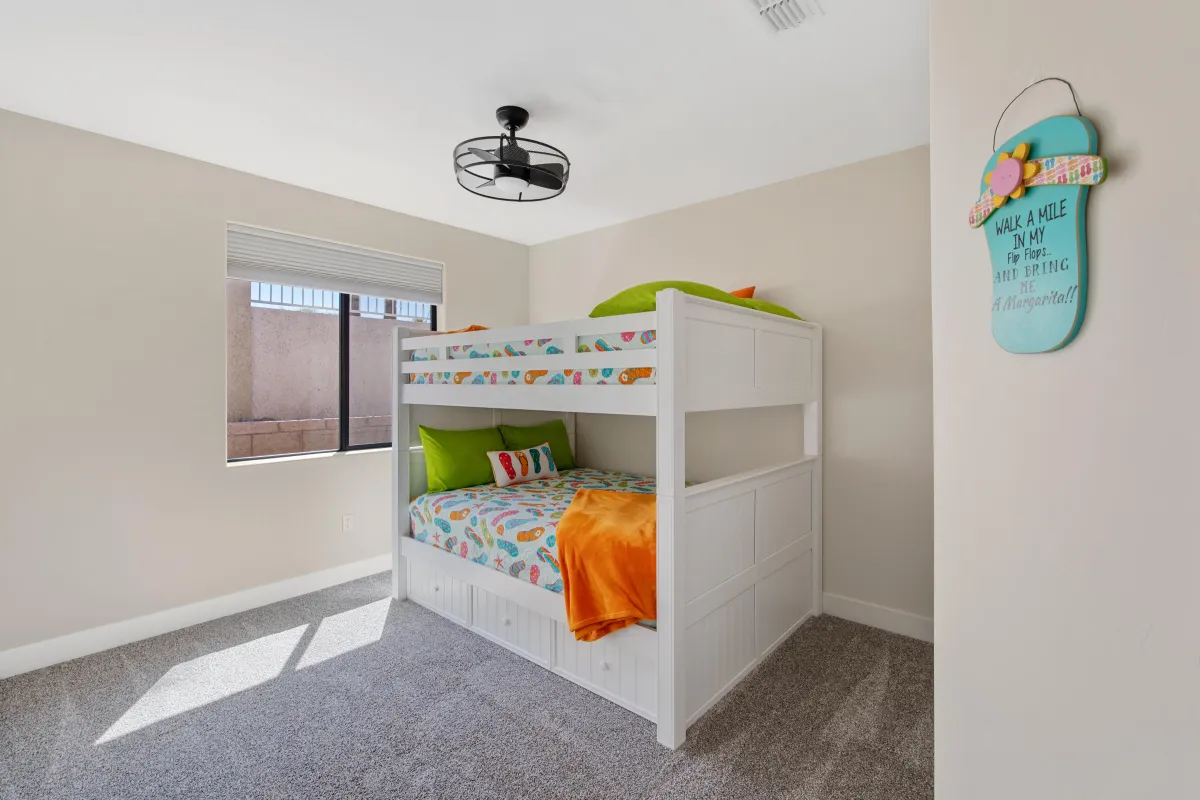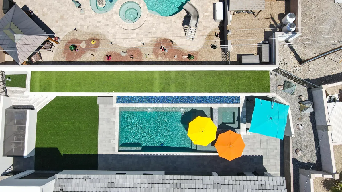 The master retreat features a walk in closet, soaking tub and dual shower heads. There is a Mini master with attached bathroom. 2 more generous sized guest bedrooms and a guest bathroom. The backyard was built for entertaining with a newly built (2023) heated pool and spa and a misting system. Pool is wired for a chiller as well. OWNED solar for low utility bills.