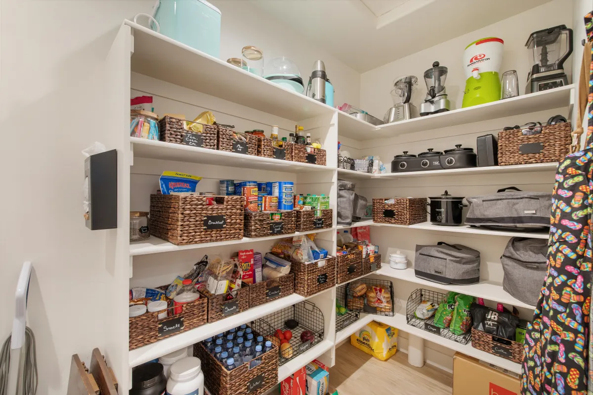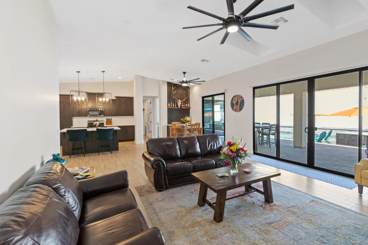 Open concept main area with a large kitchen island and the Kelco signature hidden walk in butler style pantry, custom alder cabinets, quartz countertops and a bar area with built in wine chiller.